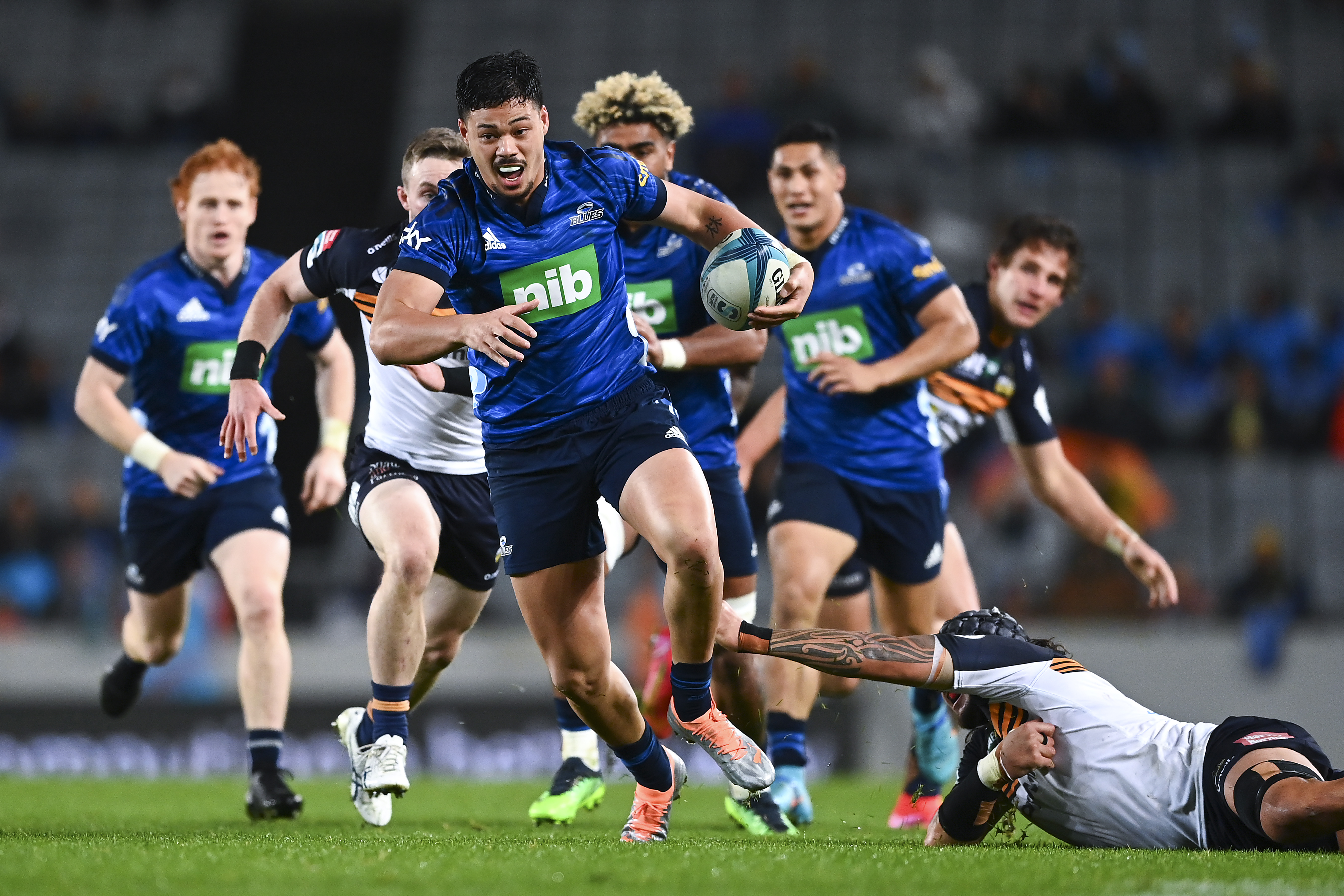 However, the Blues regathered themselves, Perofetaespecially to land two penalty goals before he ran the ball back and with contributions from halfback Finlay Christie, centre Rieko Ioane, the ever-present Barrett and finally it was No8 Hoskins Sotutu who crossed for the Blues' try response 22 minutes into the half.