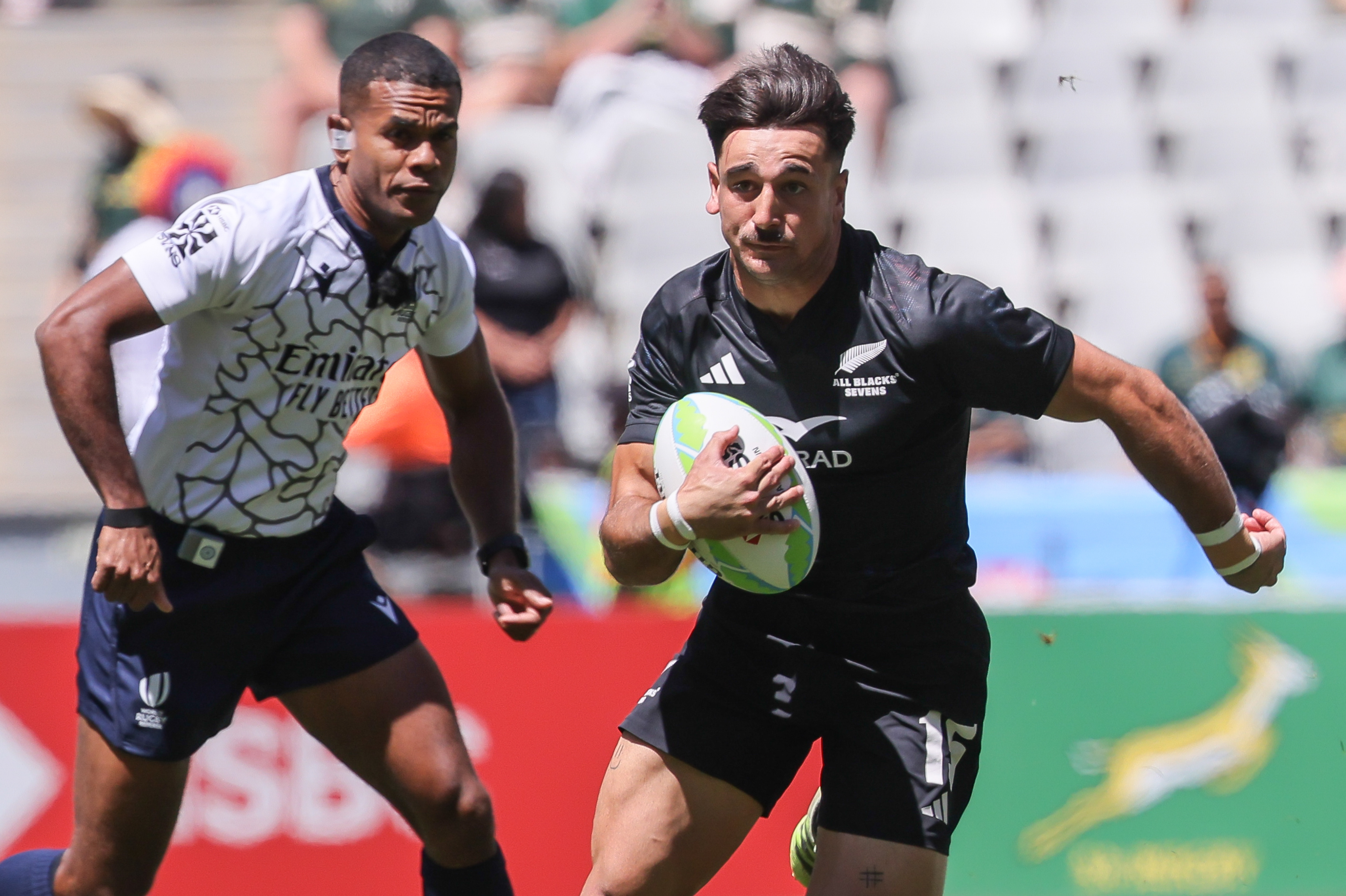 This victory set up a mouthwatering clash with the tournament hosts and eventual cup winners, South Africa. The All Blacks Sevens controlled the ill-disciplined Blitzboks in the first half, with Impi Visser, playing in his 48th SVNS tournament, and Shilton van Wyk, in his 29th SVNS tournament, both receiving yellow cards. Additionally, a converted try from New Zealand captain Tone Ng Shiu put the visitors ahead 7-0 at halftime.
