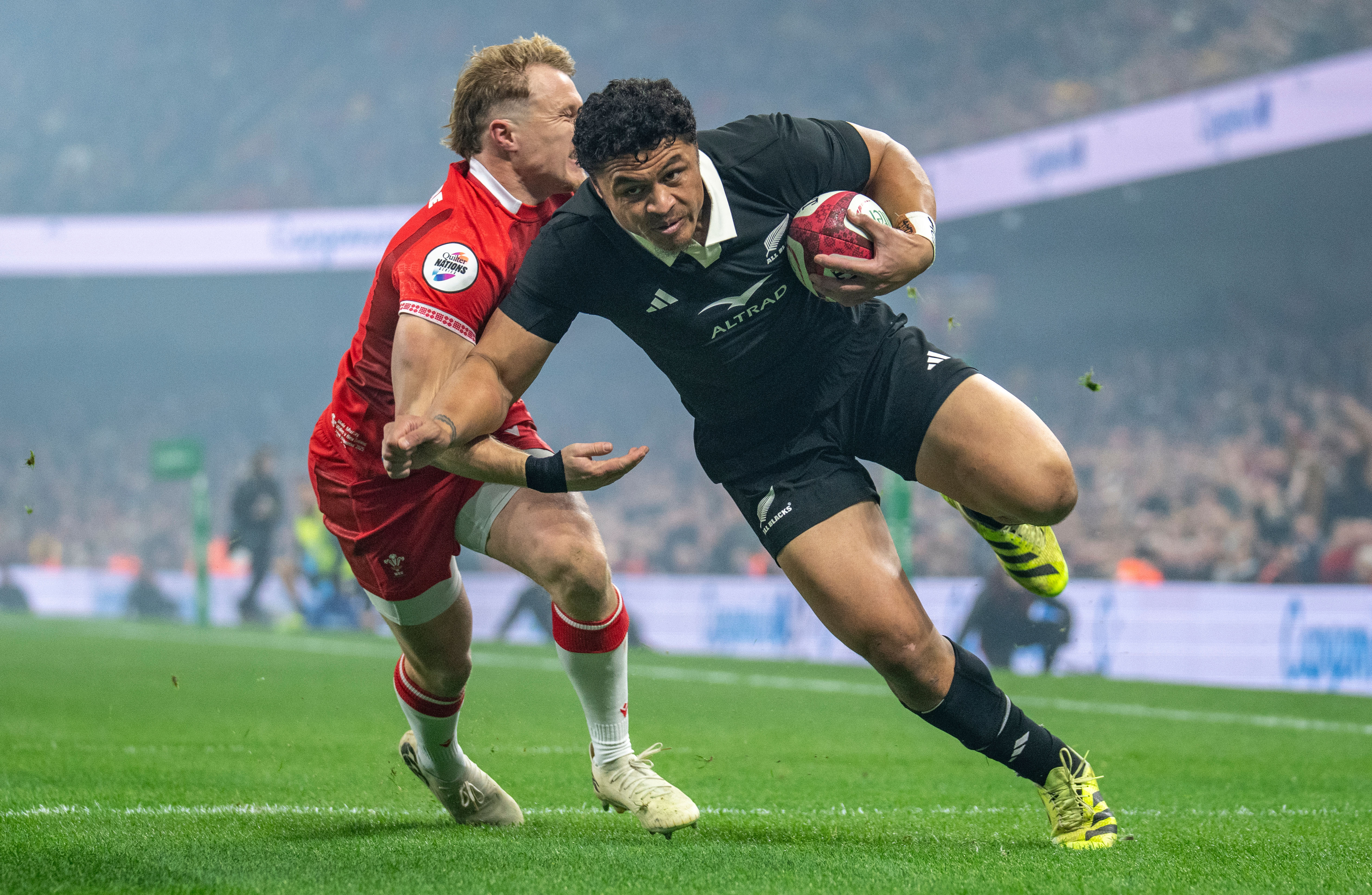 As the pace of the game took its toll, with Wales making 108 first-half tackles to 38 by the All Blacks, the All Blacks got back into Wales' 22m area. From a five-metre lineout, a low throw to Holland saw the All Blacks drive, and when the ball emerged, it was to prop Tamaiti Williams. His power was evidenced as he cork-screwed out of the grip of several defenders to score a minute from the break.